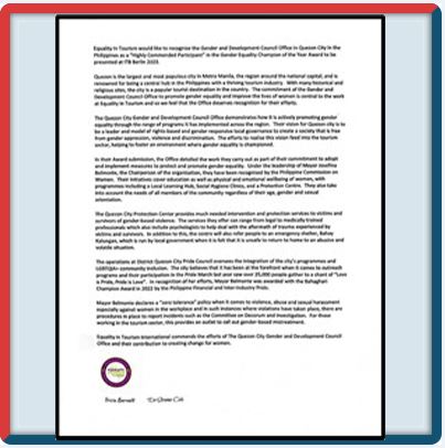 The Equality in Tourism International recognized QC GAD Council as a Highly Commended Participant in the Gender Equality Champion of the Year Award on March 8 at ITB Berlin. The Office was cited for its commitment to promote gender equality and improve the lives of women in Quezon City through its various programs.