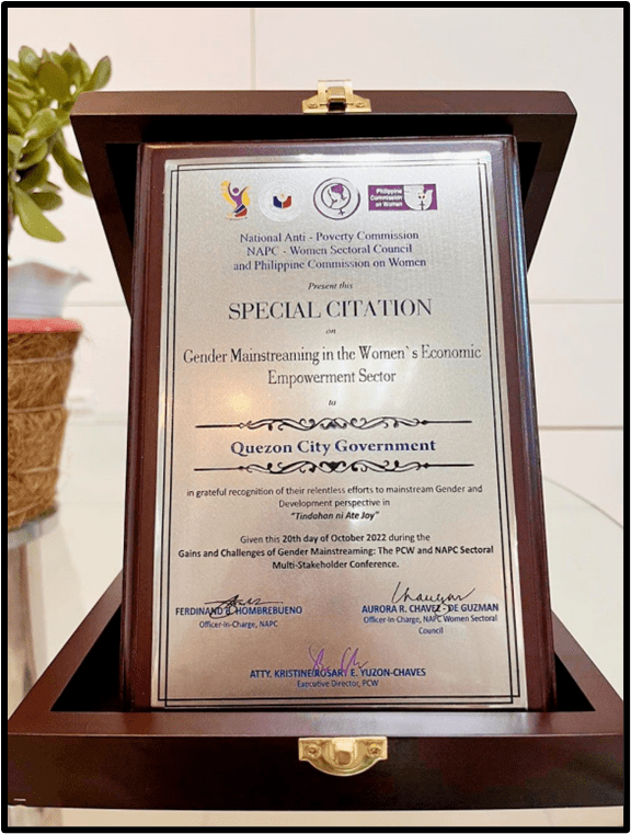 The QC Government received a Special Citation on Gender Mainstreaming in Women’s Economic Empowerment Sector from the Philippine Commission on Women and the National Anti-Poverty Commission in recognition of QC’s efforts to mainstream GAD perspective in Tindahan ni Ate Joy. The program has already provided PHP 10,000 worth of sari-sari store items to more than five thousand beneficiaries composed of solo parents, home-bound mothers, survivors of violence and abuse, released PDLs from QC Female Dormitory and housewives of drug dependents who are under treatment in the community rehabilitation centers.