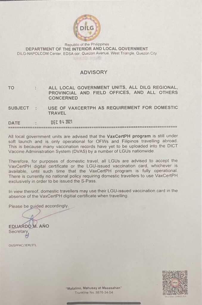 DILG Memo: Use of VAXCERTPH as Requirement for Domestic Travel