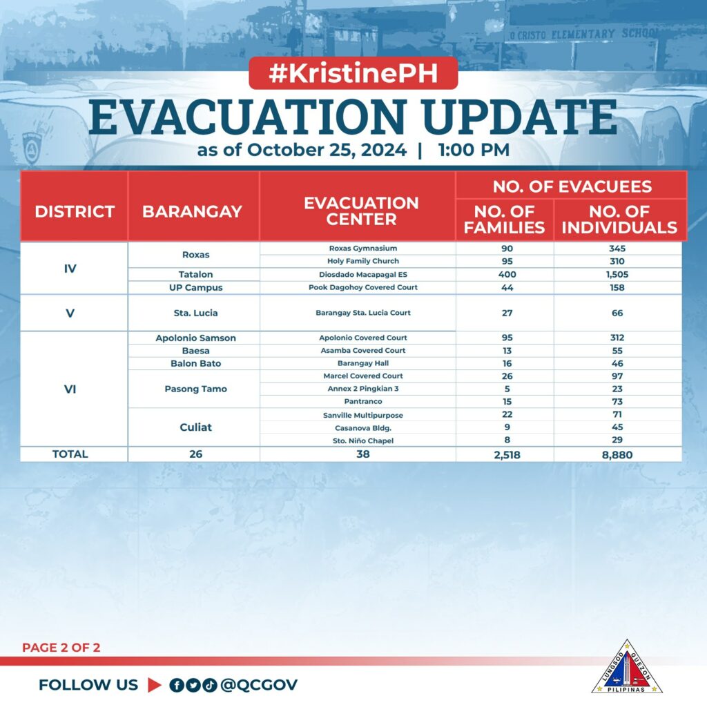 Bilang pag-iingat sa pagbaha na dulot ng walang-tigil na pag-ulan bunsod ng Bagyong #KristinePH, mayroong itinalagang evacuation sites sa mga piling lugar na bahain o may banta ng landslide para sa ligtas at mabilis na paglikas ng humigit-kumulang 2,518 na pamilya o 8,880 na indibidwal sa ating lungsod.
