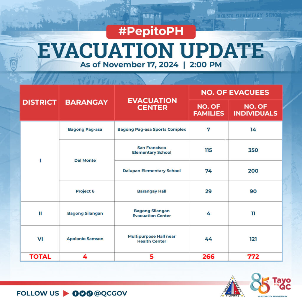 Bilang pag-iingat sa pagbaha na dulot ng mga pag-ulan bunsod ng Bagyong #PepitoPH, mayroong itinalagang evacuation sites sa mga piling lugar na bahain o may banta ng landslide para sa ligtas at mabilis na paglikas ng humigit-kumulang 266 na pamilya o 772 na indibidwal sa ating lungsod.