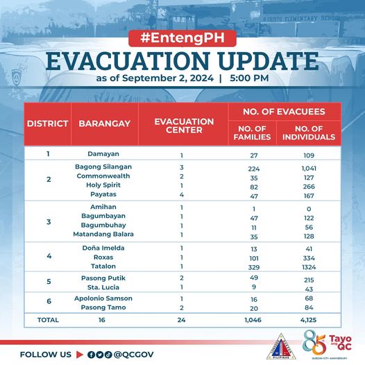 Bilang pag-iingat sa pagbaha na dulot ng Tropical Storm #EntengPH, mayroong itinalagang evacuation sites sa mga piling lugar na bahain o may banta ng landslide para sa ligtas at mabilis na evacuation ng humigit-kumulang 1,046 na pamilya o 4,125 na indibidwal sa ating lungsod.