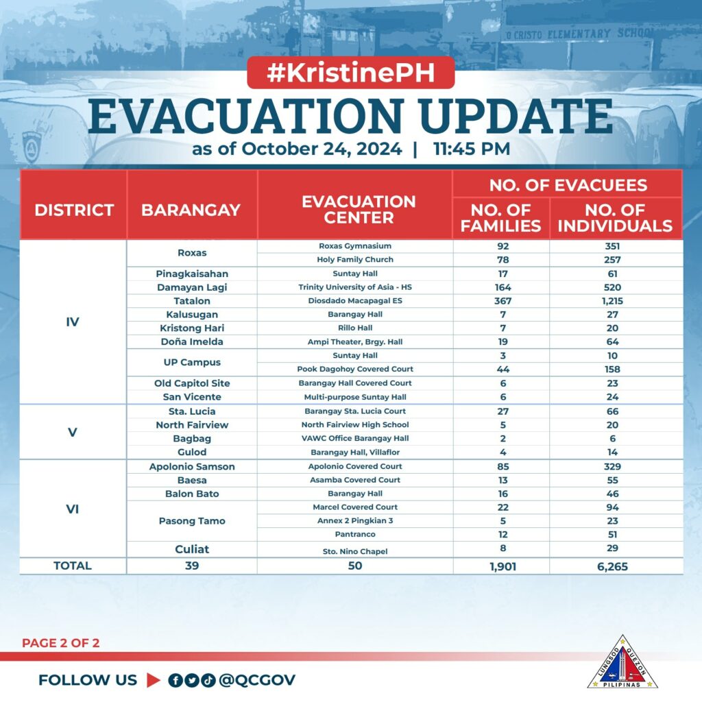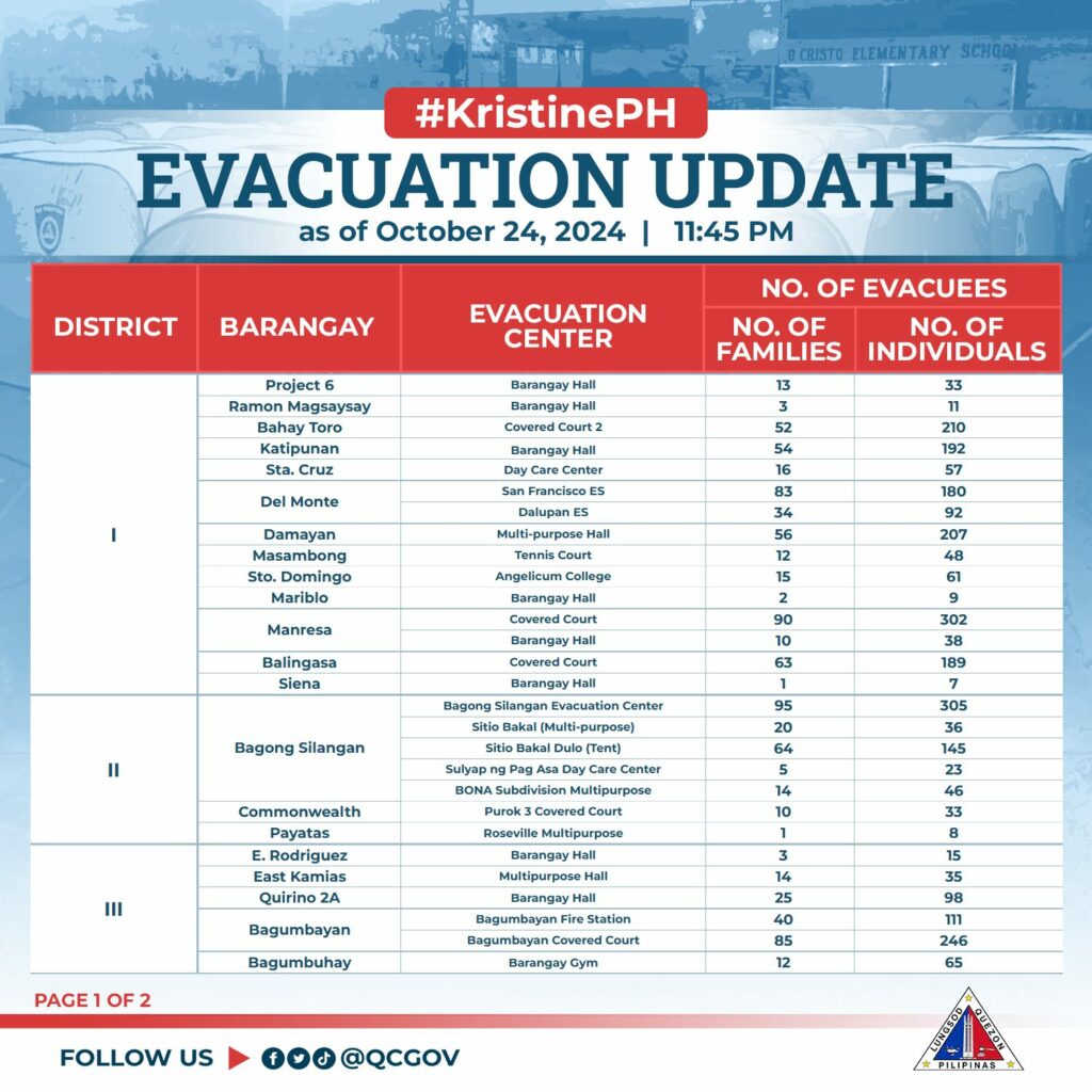 Bilang pag-iingat sa pagbaha na dulot ng walang tigil na pag-ulan bunsod ng Bagyong #KristinePH mayroong itinalagang evacuation sites sa mga piling lugar na bahain o may banta ng landslide para sa ligtas at mabilis na evacuation ng humigit-kumulang 1,901 na pamilya o 6,265 na indibidwal sa ating lungsod.