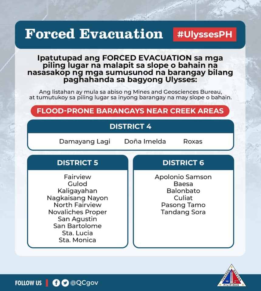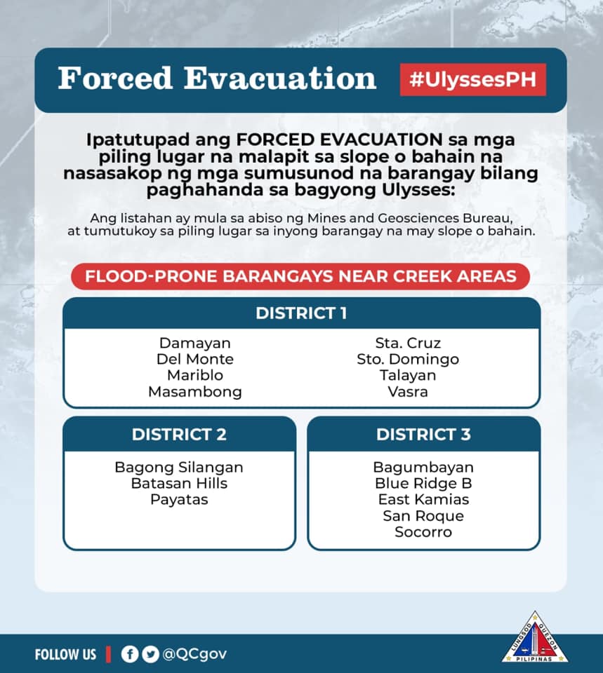 Ipinatutupad na ang forced evacuation sa mga piling lugar na bahain o may banta ng landslide sa mga sumusunod na barangay: