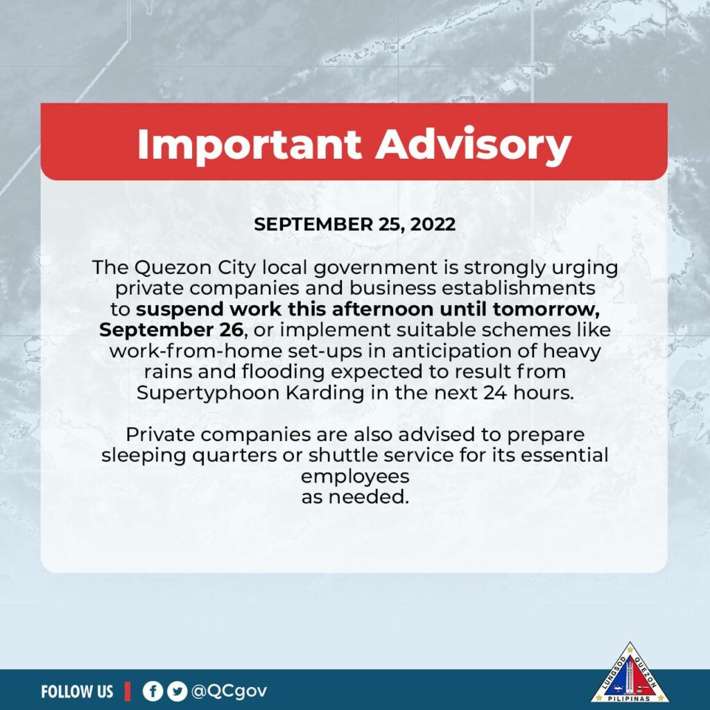 The Quezon City local government is strongly urging private companies and business establishments to suspend work this afternoon until tomorrow, September 26, or implement suitable schemes like work-from-home set-ups in anticipation of heavy rains and flooding expected to result from Supertyphoon Karding in the next 24 hours.