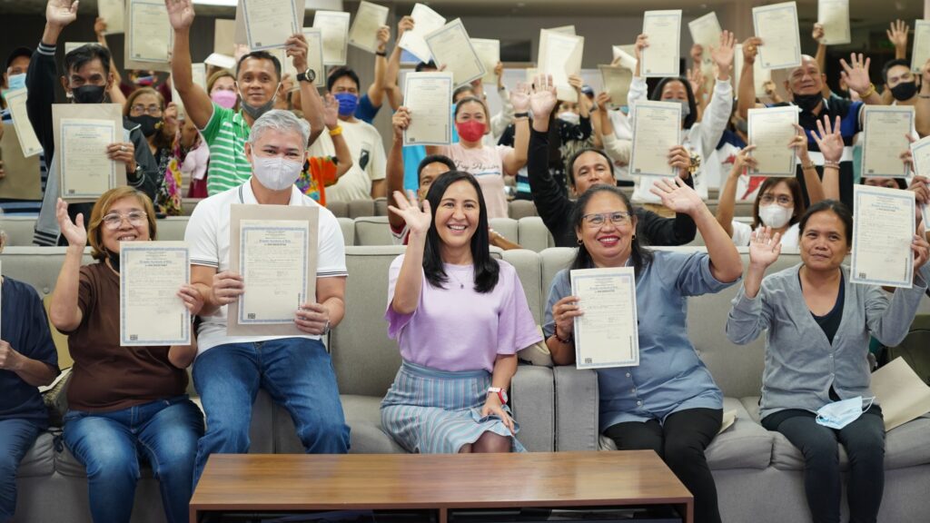 May be an image of 13 people, indoor and text that says "WD AWARDING OF TRANSFER CERTIFICATE OF TITLES (TCTs) BAYAN Hal QuezonCity QUEZON PILIPINAS"