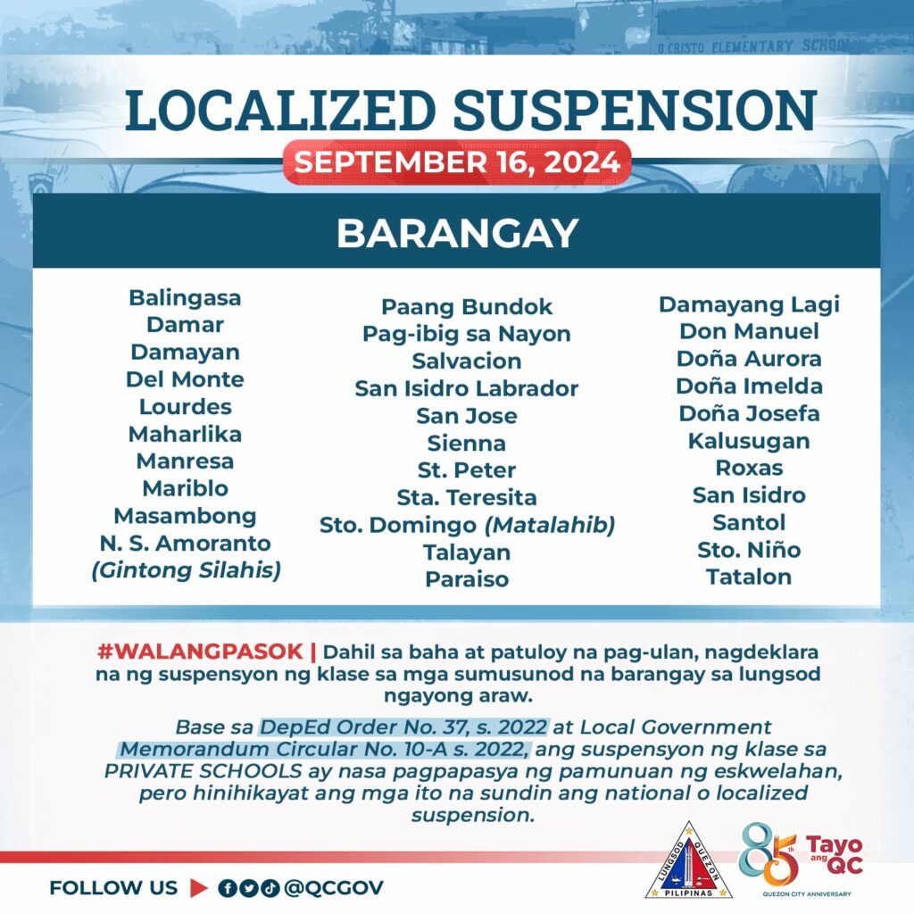#WALANGPASOK | Dahil sa banta ng matinding pagbaha at pag-ulan, inirekomenda ng Quezon City Disaster Risk Reduction and Management Council (QCDRRMC) ang suspensyon ng klase sa mga pampublikong paaralan sa mga sumusunod na barangay sa lungsod ngayong Lunes, Setyembre 16, 2024: