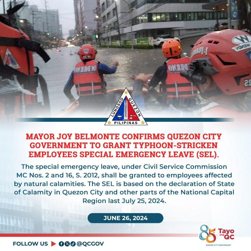 Kinumpirma ni Mayor Joy Belmonte na magbibigay ang Quezon City Government ng Special Emergency Leave (SEL) sa mga empleyadong nasalanta ng bagyo.