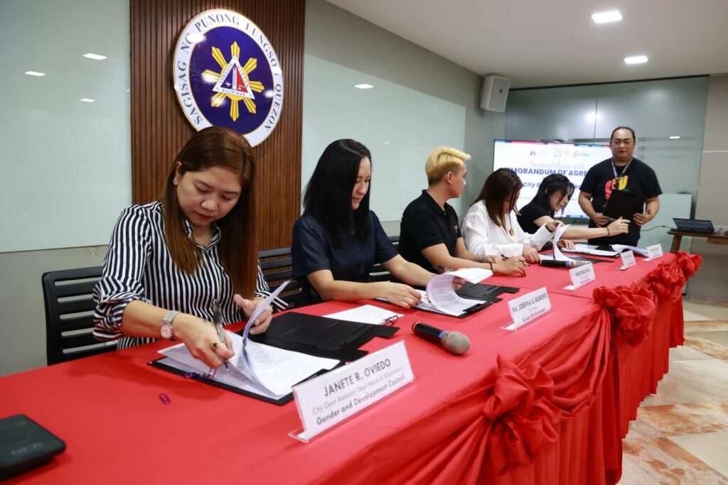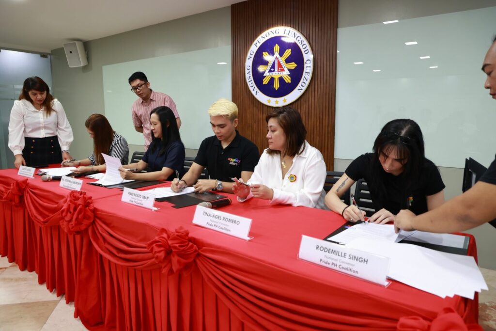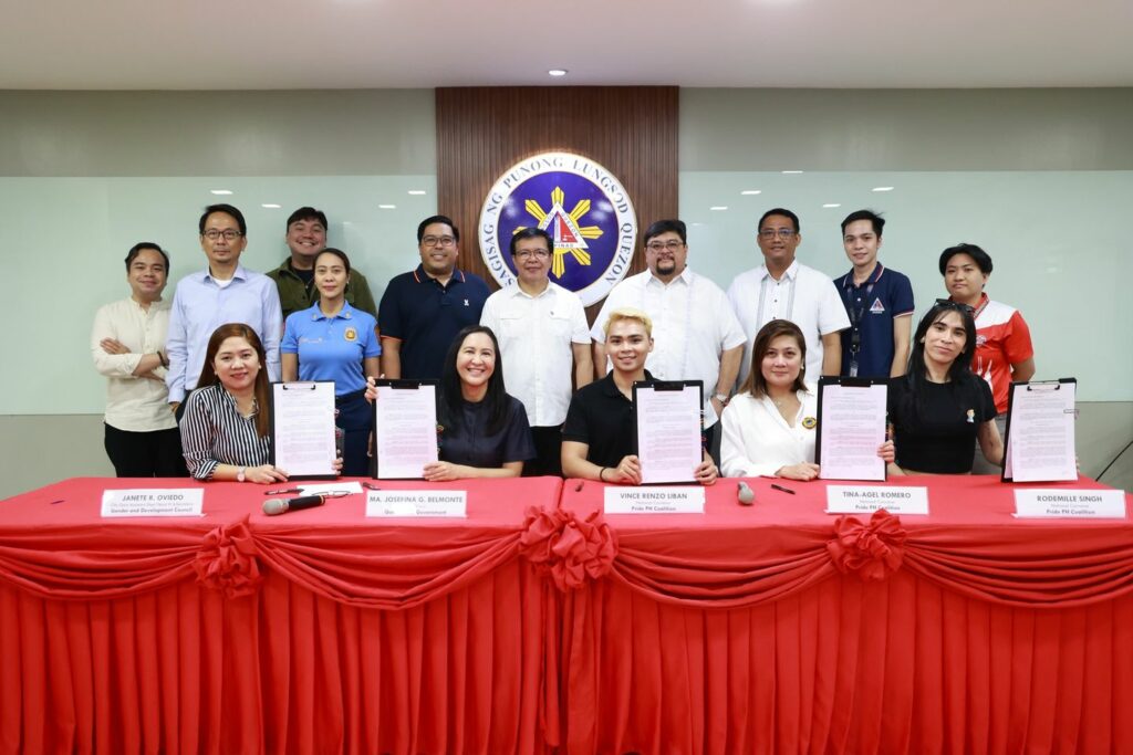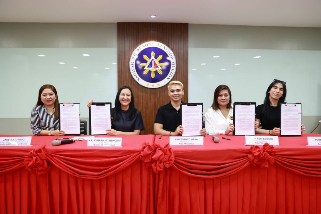 Dumalo sa MOA signing sina Mayor Joy Belmonte, Gender and Development Council Secretary Janete Oviedo, at mga National Convenor ng Pride PH Coalition na sina Vince Renzo Liban, Tina-Agel Romero at Rodemille Singh.