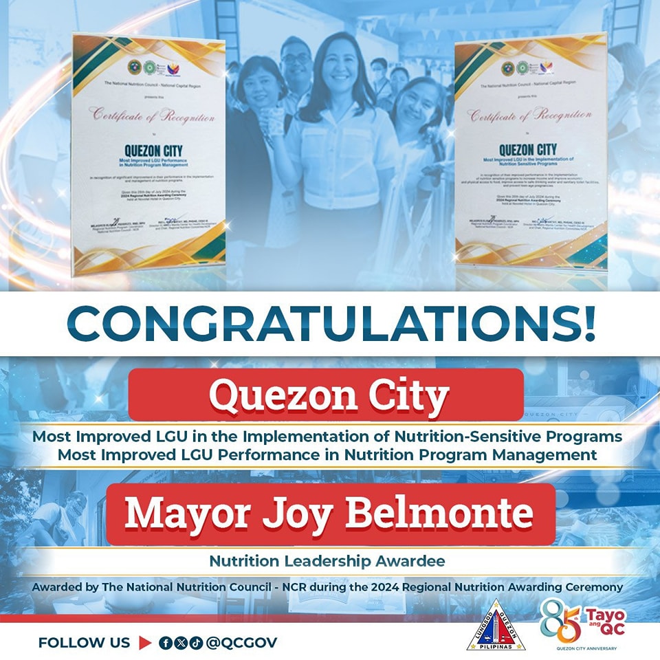 Kinilala ng National Nutrition Council ang Quezon City Government bilang Most Improved LGU in the Implementation of Nutrition-Sensitive Programs at Most Improved LGU Performance in Nutrition Program Management.