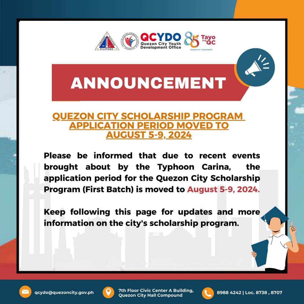 ANNOUNCEMENT Quezon City Scholarship Program Application Period Moved to August 5-9, 2024 Please be informed that due to recent events...