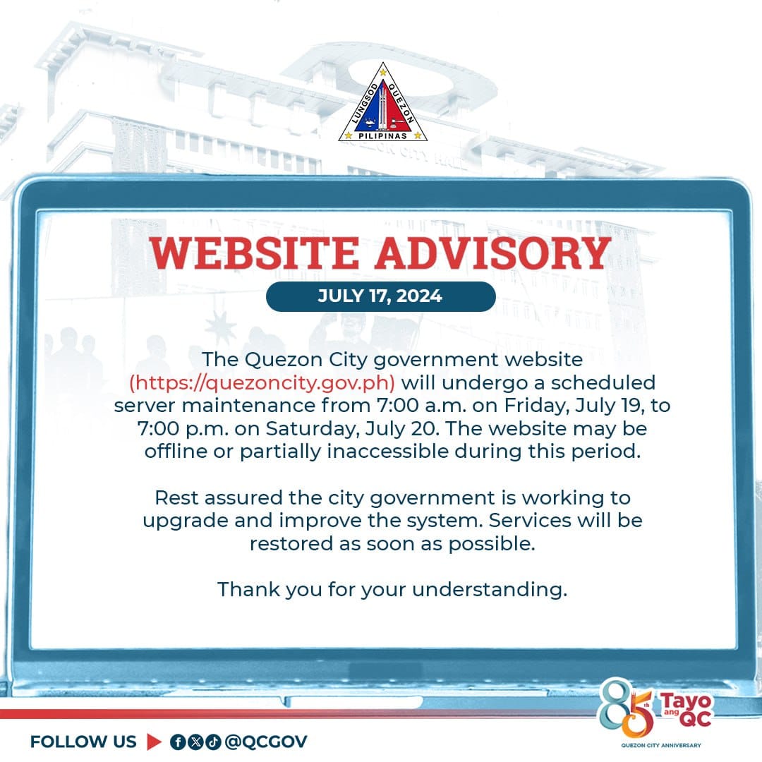 WEBSITE ADVISORY The Quezon City government website (https://qcwebsite.sparksoft-demo.com) will undergo a scheduled server maintenance from 7:00 a.m. on Friday, July...