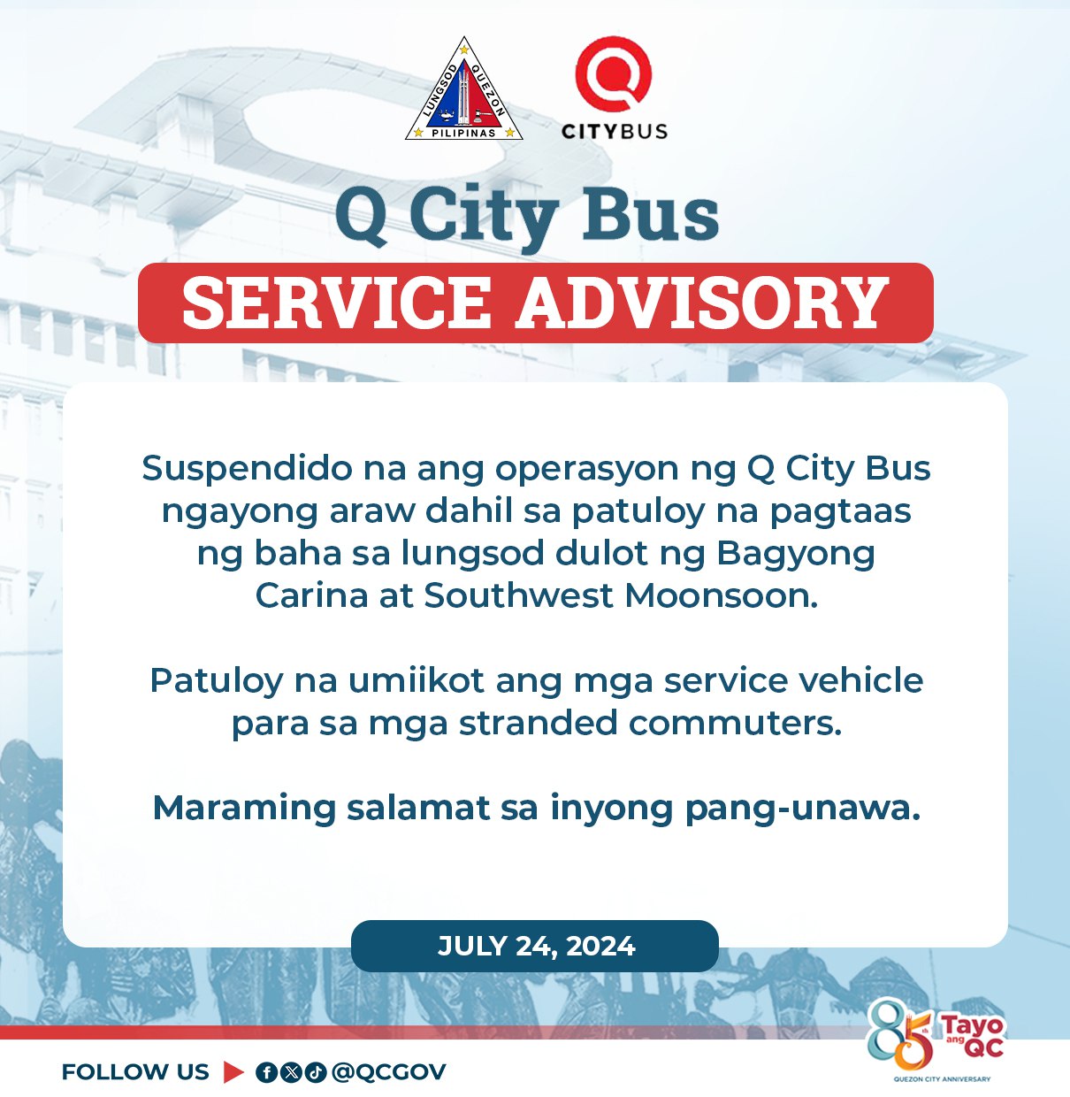 Suspendido na ang operasyon ng Q City Bus ngayong araw dahil sa patuloy na pagtaas ng baha sa lungsod dulot...