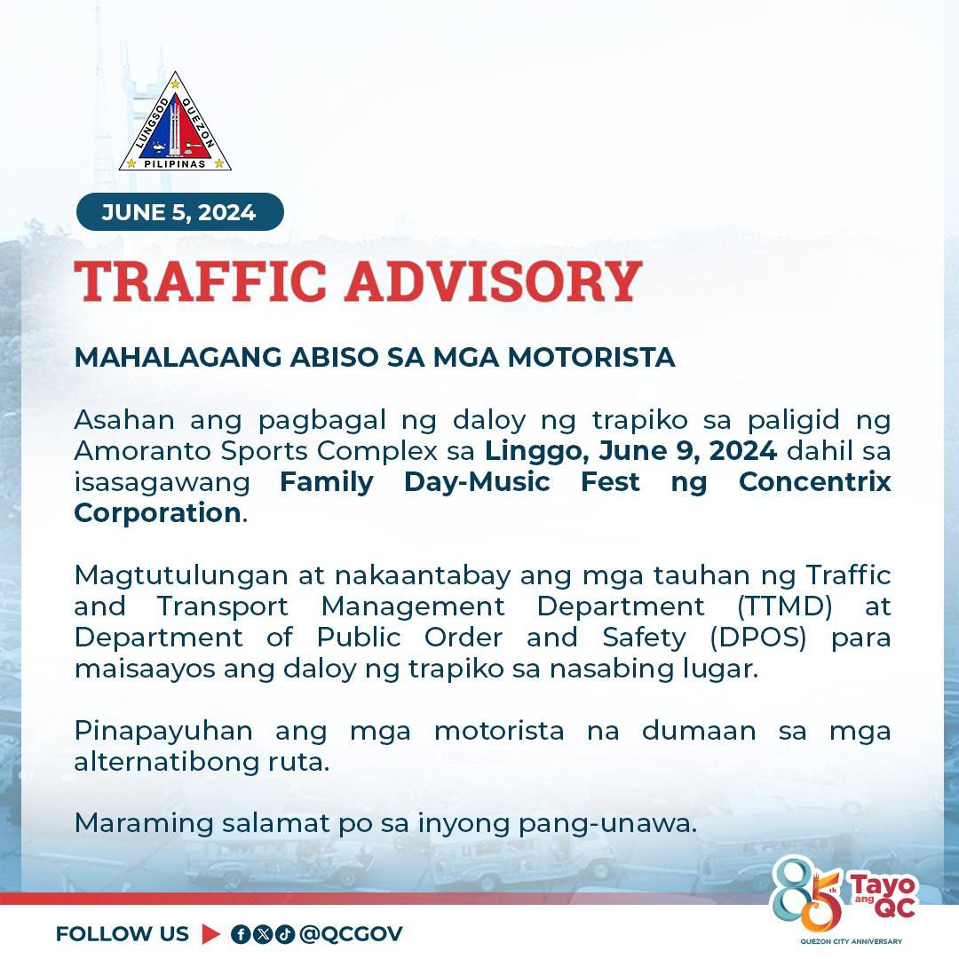 MAHALAGANG ABISO SA MGA MOTORISTA Asahan ang pagbagal ng daloy ng trapiko sa paligid ng Amoranto Sports Complex sa Linggo,...