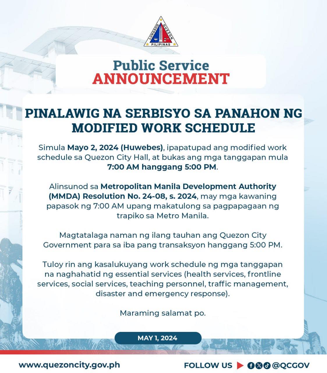 [Public Service Announcement] Simula Mayo 2, 2024 (Huwebes), ipapatupad ang modified work schedule sa Quezon City Hall, at bukas ang...