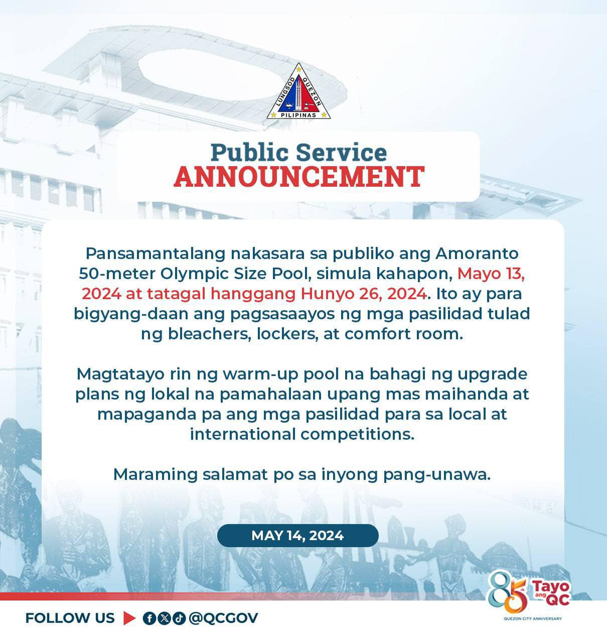 [Public Service Announcement] Pansamantalang nakasara sa publiko ang Amoranto 50-meter Olympic Size Pool, simula Mayo 13, 2024 at tatagal hanggang...