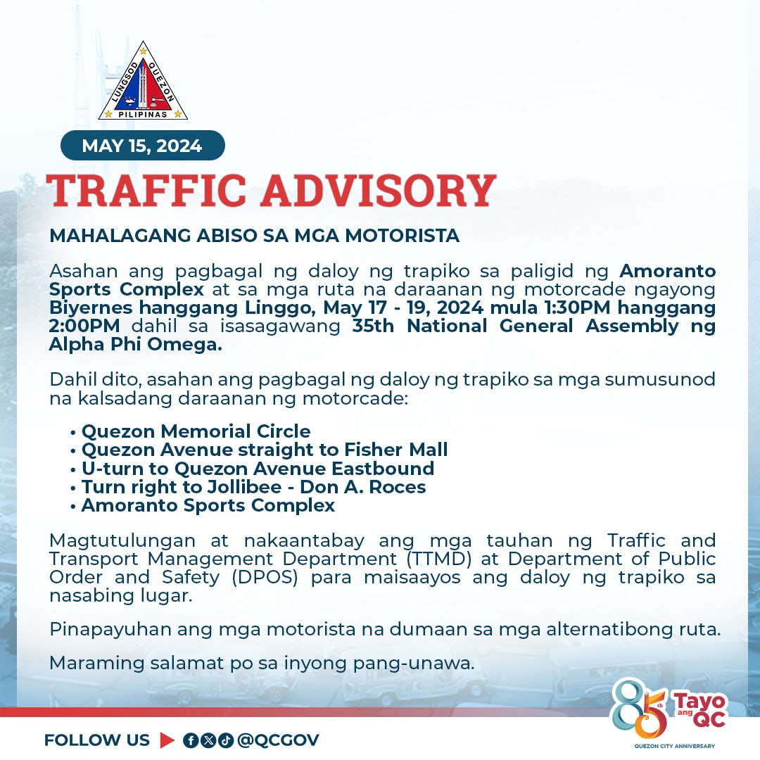 MAHALAGANG ABISO SA MGA MOTORISTA Asahan ang pagbagal ng daloy ng trapiko sa paligid ng Amoranto Sports Complex at sa...