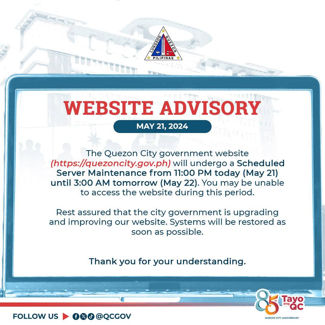 The Quezon City government website will undergo a Scheduled Server Maintenance from 11:00 PM today (May 21) until 3:00 AM...