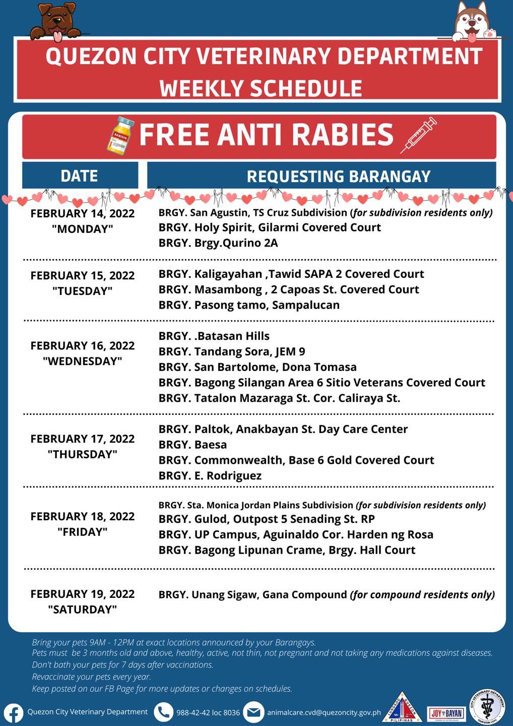 QCitizens, tingnan ang schedule ng libreng anti-rabbies vaccine at libreng kapon para sa inyong mga alagang hayop ngayong linggo. Magpunta...