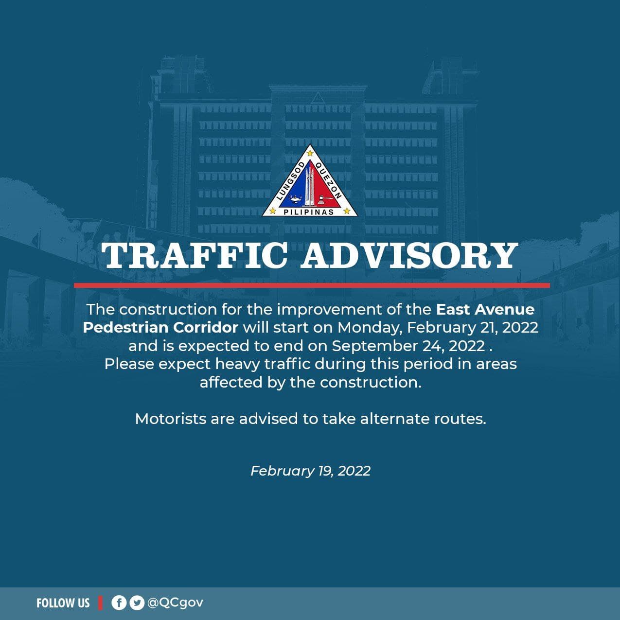 Abiso sa mga motorista, sisimulan na sa Lunes, February 21, 2022 ang konstruksyon ng East Avenue Pedestrian Corridor. Inaasahang matatapos...
