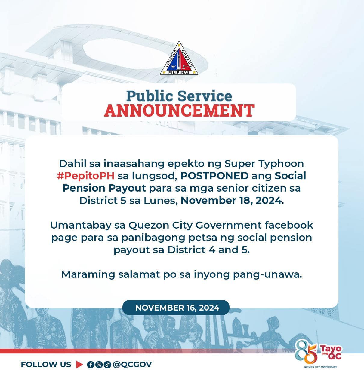 PUBLIC SERVICE ANNOUNCEMENT Dahil sa inaasahang epekto ng Super Typhoon #PepitoPH sa lungsod, POSTPONED ang Social Pension Payout para sa...