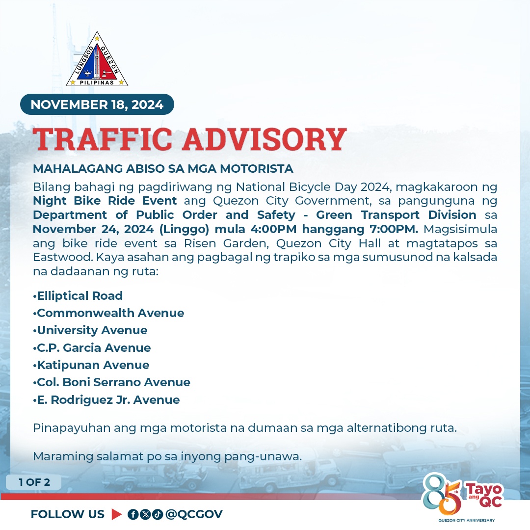MAHALAGANG ABISO SA MGA MOTORISTA Bilang bahagi ng pagdiriwang ng National Bicycle Day 2024, magkakaroon ng Night Bike Ride Event...