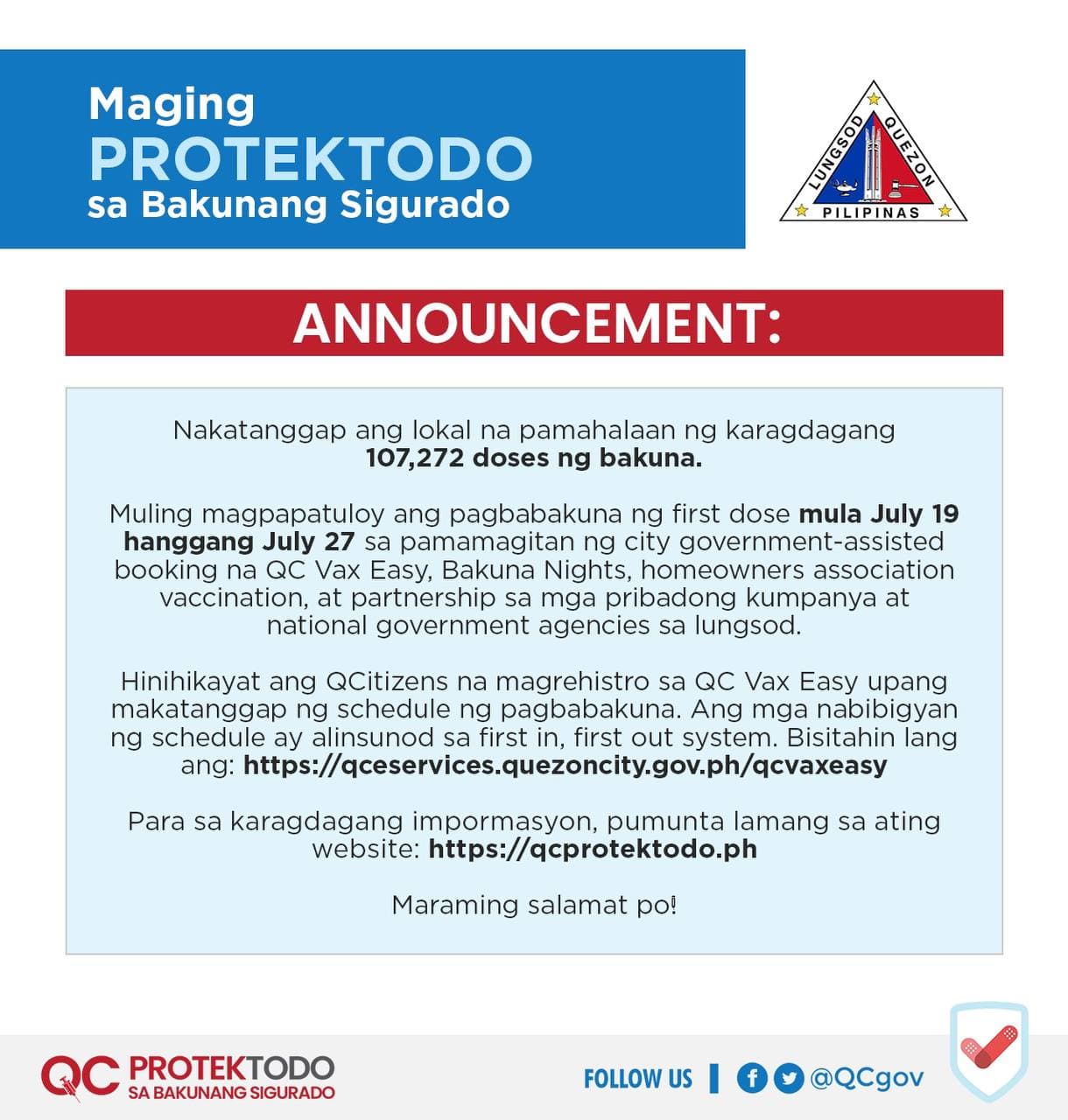 Nakatanggap ang lokal na pamahalaan ng karagdagang 107,272 doses ng bakuna. Muling magpapatuloy ang ating #QCProtekTODO Vaccination Program para magbakuna...