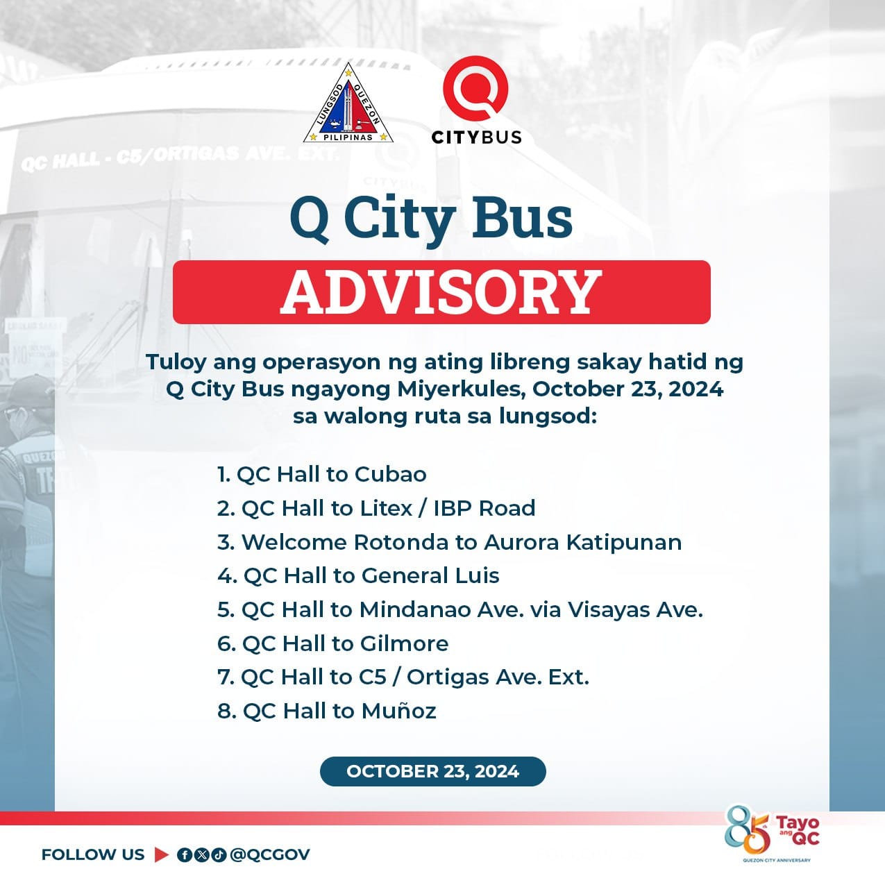 Tuloy ang operasyon ng ating libreng sakay hatid ng Q City Bus ngayong Miyerkules, October 23, 2024 sa walong ruta...