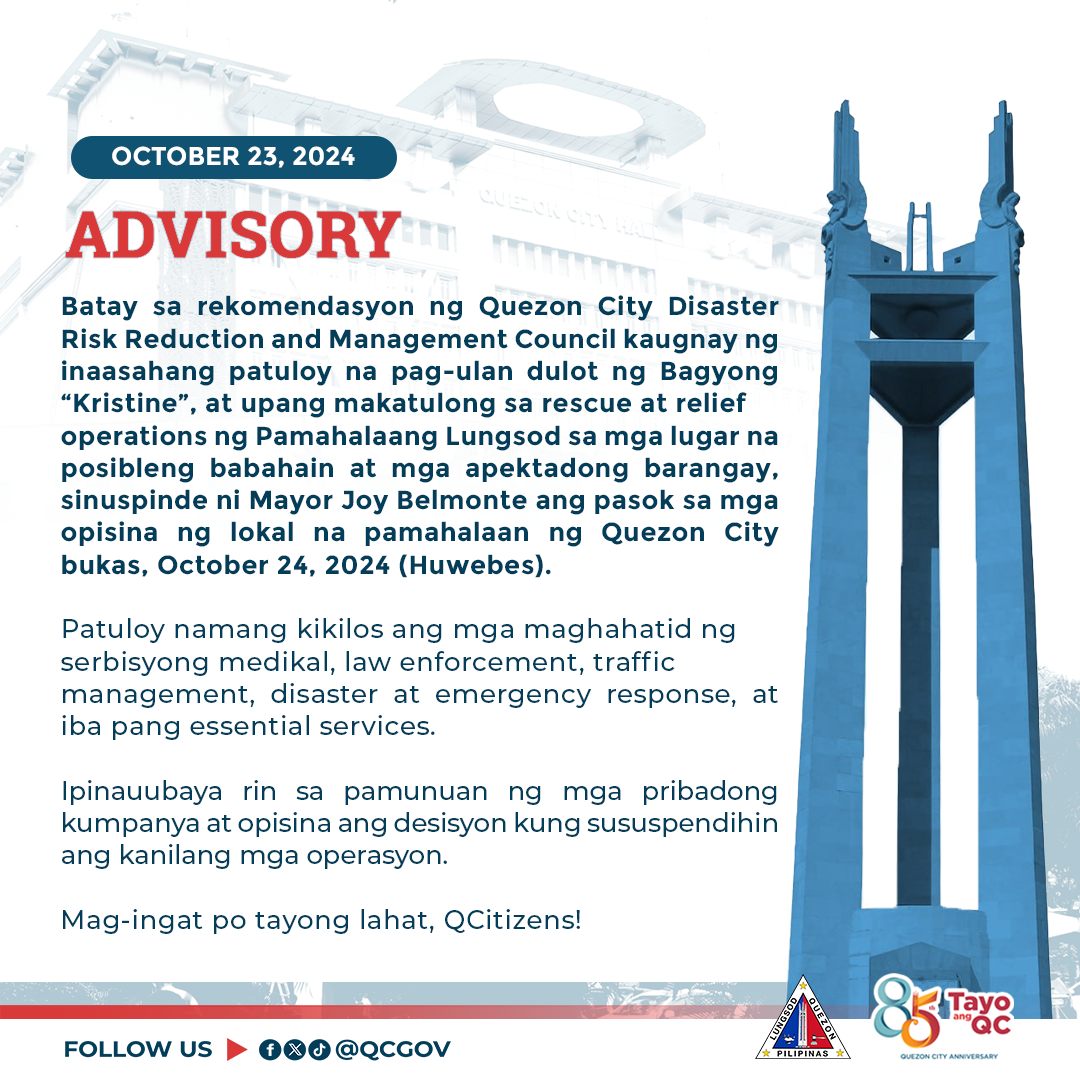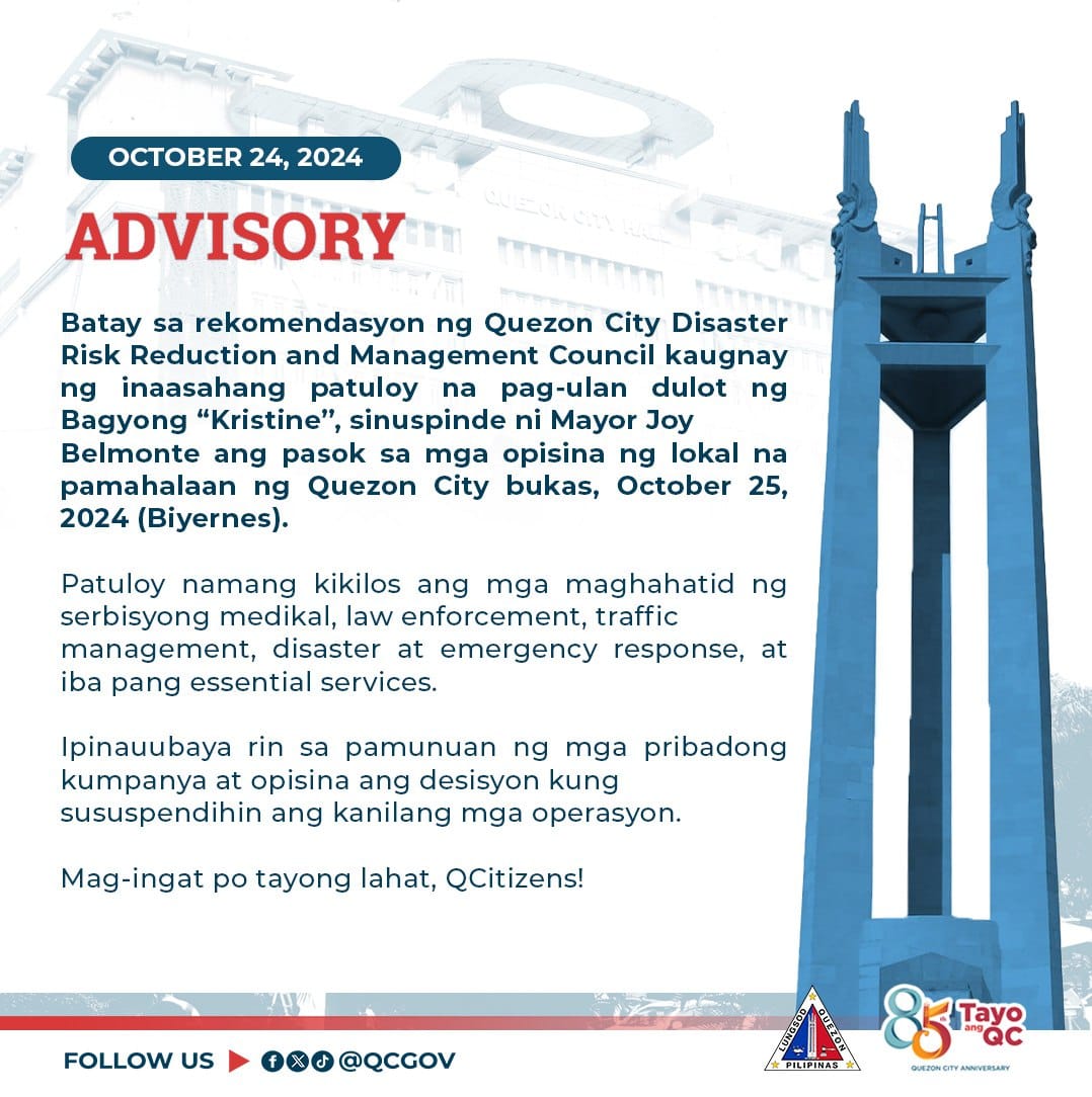 Quezon City Hall Suspension Advisory – October 24, 2024