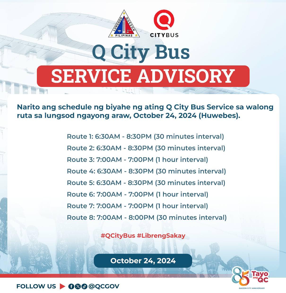 Narito ang schedule ng biyahe ng ating Q City Bus Service sa walong ruta sa lungsod ngayong araw, October 24,...
