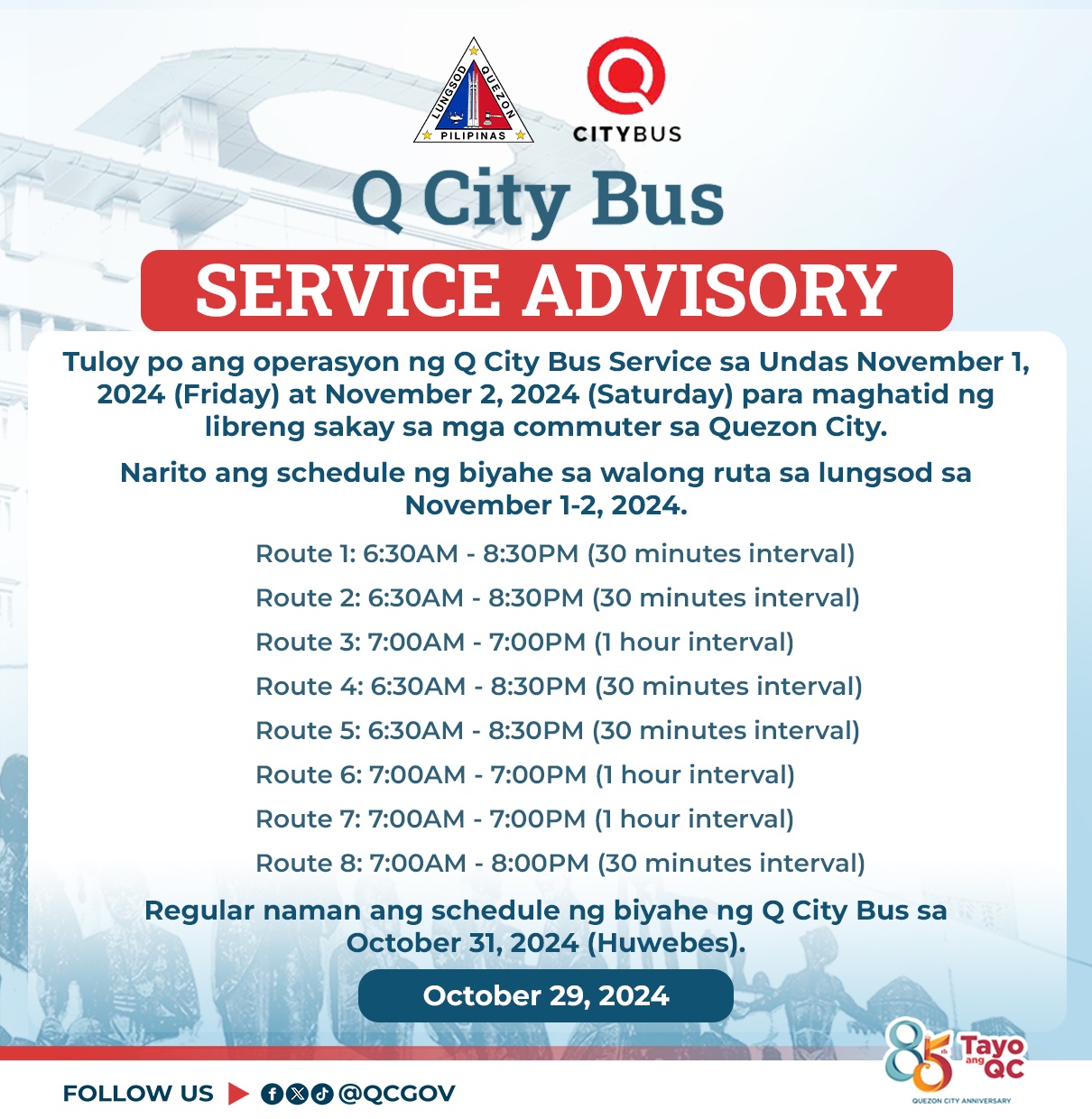 Tuloy po ang operasyon ng ating Q City Bus Service sa Undas November 1, 2024 (Friday) at November 2, 2024...
