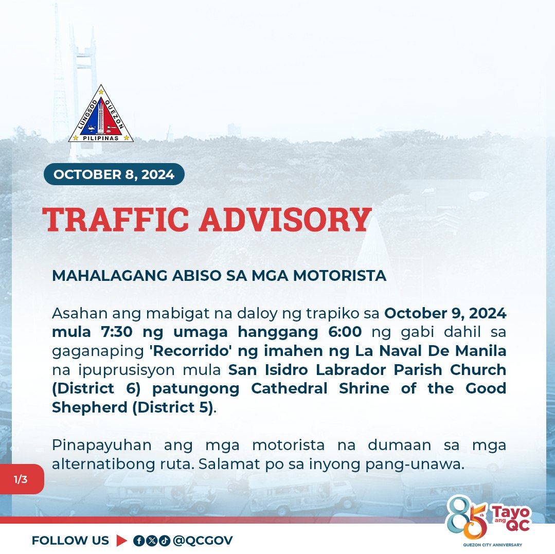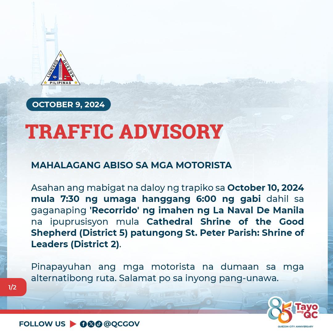 MAHALAGANG ABISO SA MGA MOTORISTA Asahan ang mabigat na daloy ng trapiko sa October 9, 2024 mula 7:30 ng umaga...