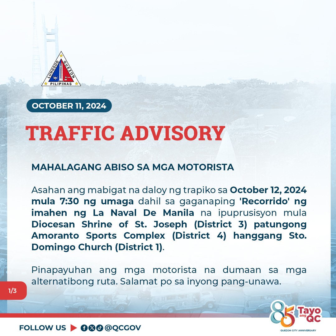 MAHALAGANG ABISO SA MGA MOTORISTA Asahan ang mabigat na daloy ng trapiko sa October 12, 2024 mula 7:30 ng umaga...
