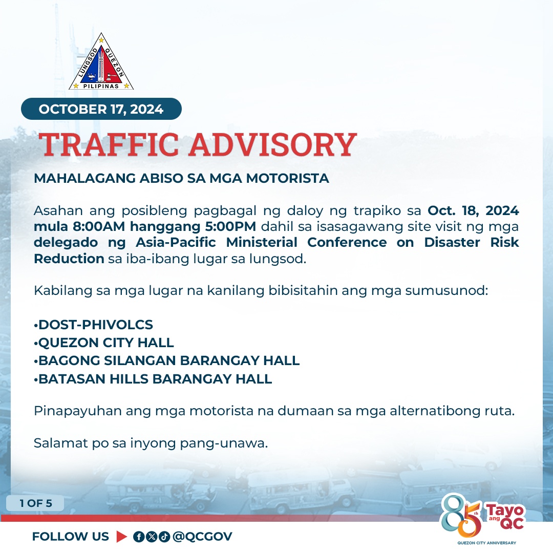 Mahalagang abiso sa mga motorista Asahan ang posibleng pagbagal ng daloy ng trapiko sa Oct. 18, 2024 mula 8:00AM hanggang...