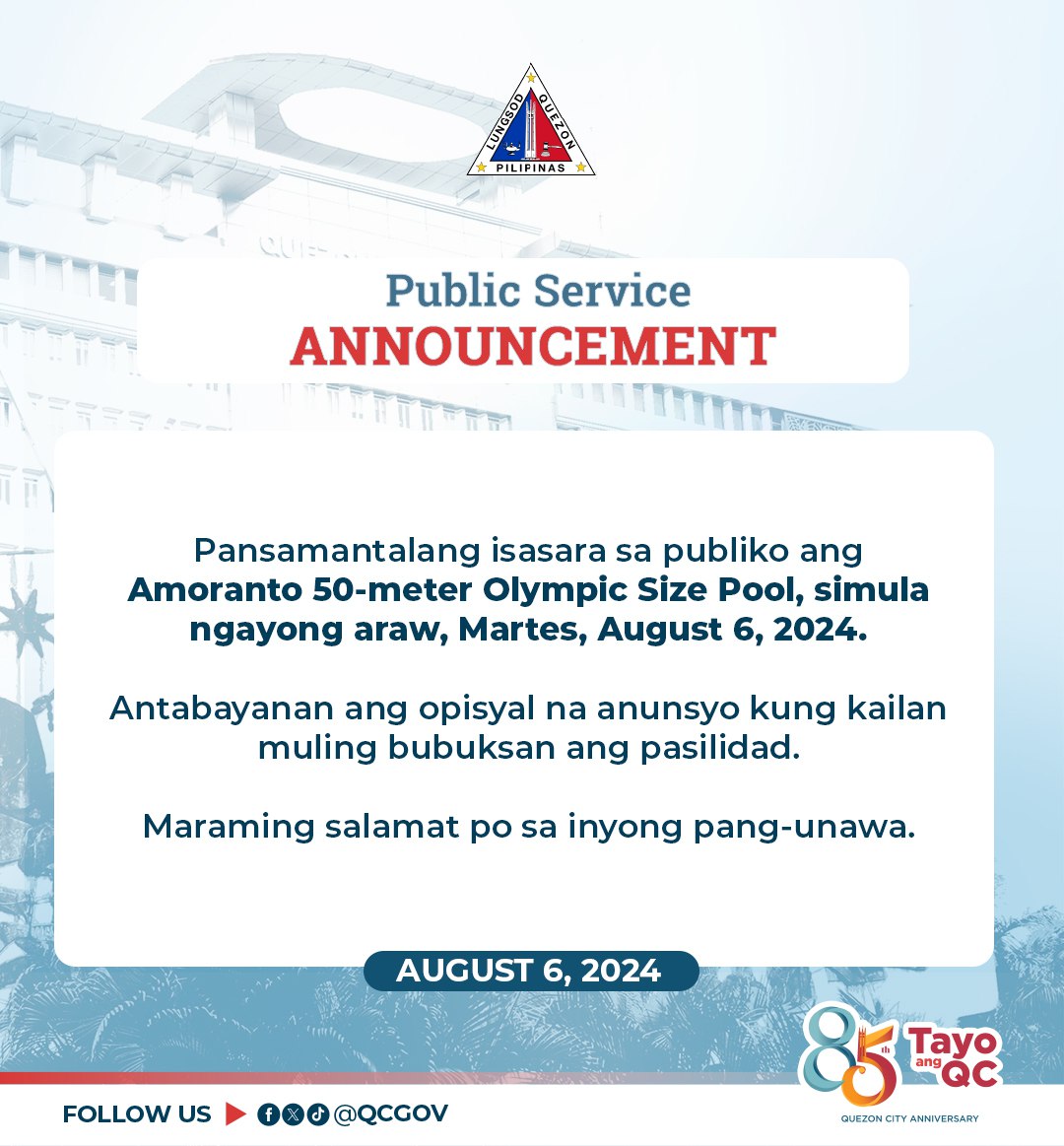 [Public Service Announcement] Pansamantalang isasara sa publiko ang Amoranto 50-meter Olympic Size Pool, simula ngayong araw, Martes, August 6, 2024....