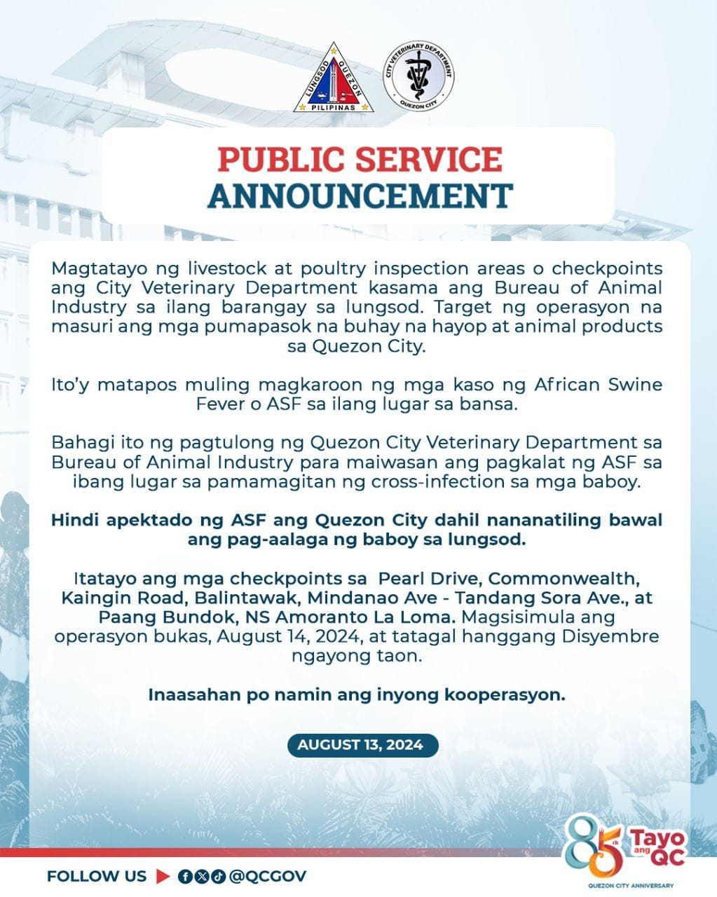 PUBLIC SERVICE ANNOUNCEMENT Magtatayo ng livestock at poultry inspection areas o checkpoints ang City Veterinary Department kasama ang Bureau of...