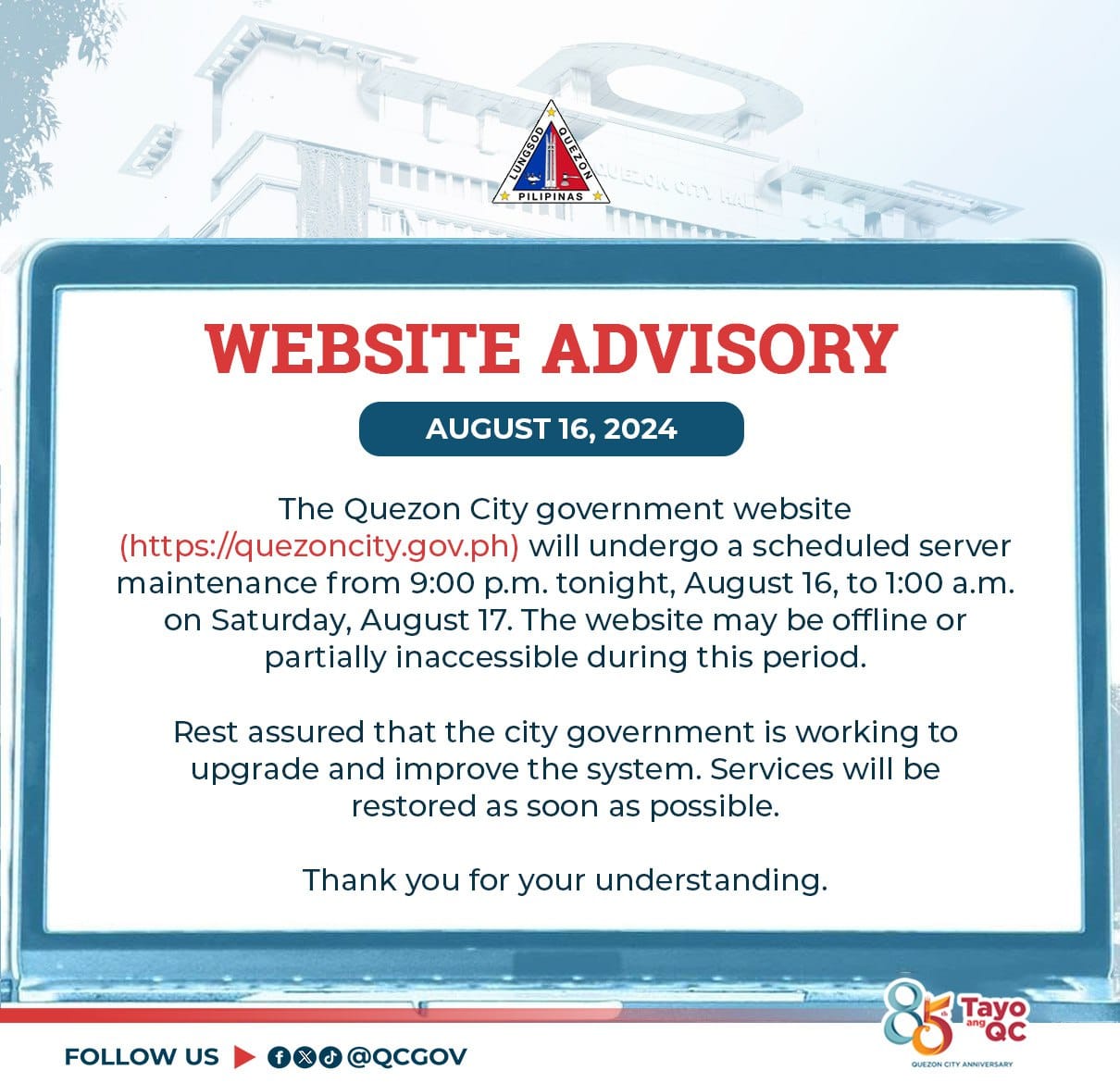 WEBSITE ADVISORY The Quezon City government website (https://qcwebsite.sparksoft-demo.com) will undergo a scheduled server maintenance from 9:00 p.m. tonight, August 16,...