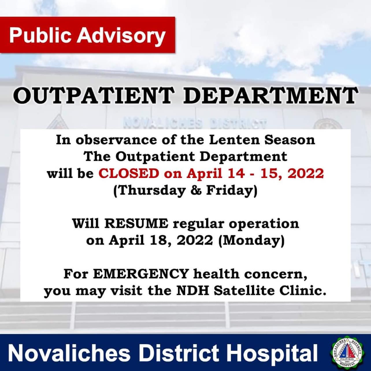 Bilang paggunita sa panahon ng kwaresma, pansamantalang isasara ng Novaliches District Hospital ang kanilang Outpatient Department (OPD) mula April 14-15, 2022 (Huwebes at Biyernes). Muli naman itong bubuksan sa April 18, 2022 (Lunes).