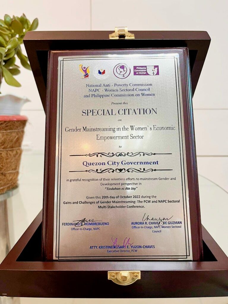 Binigyan ng Special Citation on Gender Mainstreaming in Women’s Economic Empowerment Sector ng Philippine Commission on Women at National Anti-Poverty Commission ang Tinahan ni Ate Joy Program ng Quezon City Government na nagbibigay ng kakayahan sa mga kababaihan na magkaroon ng maayos na kabuhayan.