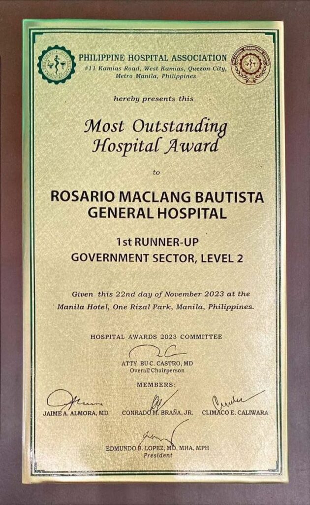 Iginawad naman sa Rosario Maclang Bautista General Hospital ang Most Outstanding Hospital – 1st runner up para sa level 2 category.