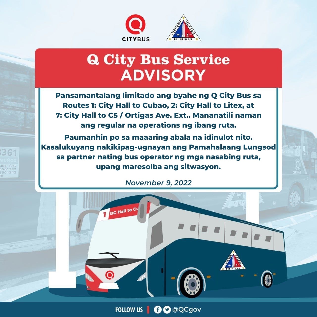 Paumanhin po sa maaaring abala na idinulot nito. Kasalukuyang nakikiugnay ang Pamahalaang Lungsod sa partner nating bus operator ng mga nasabing ruta, upang maresolba ang sitwasyon.