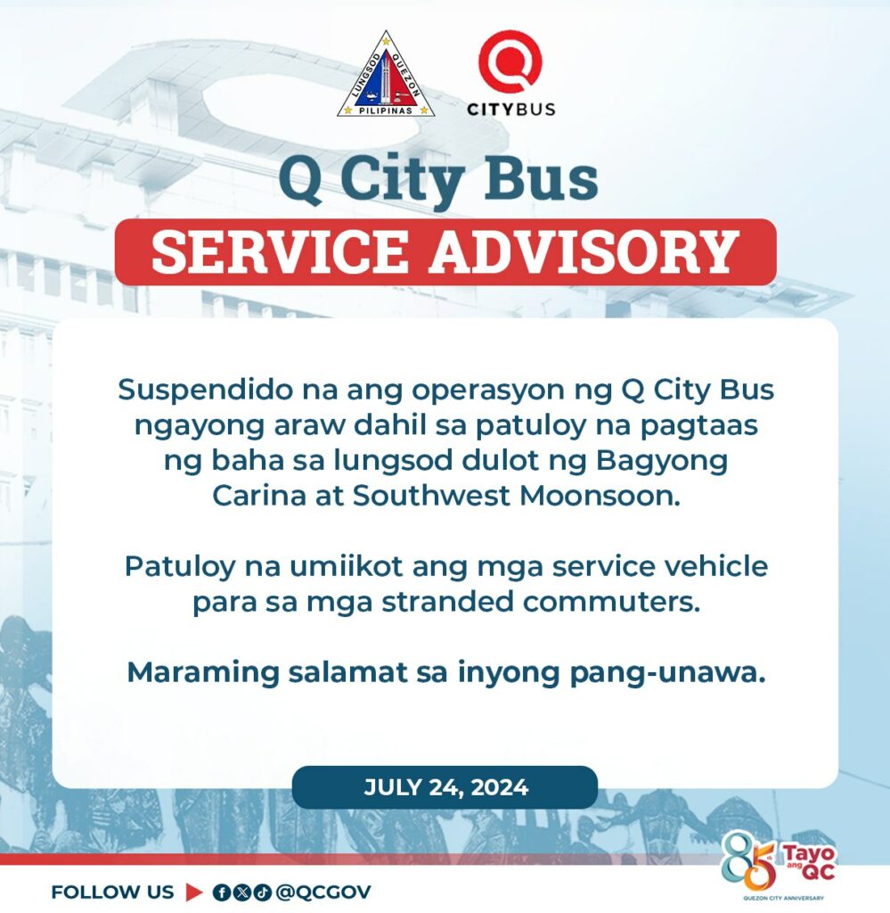 Suspendido na ang operasyon ng Q City Bus ngayong araw dahil sa patuloy na pagtaas ng baha sa lungsod dulot ng Bagyong Carina at Southwest Moonsoon.