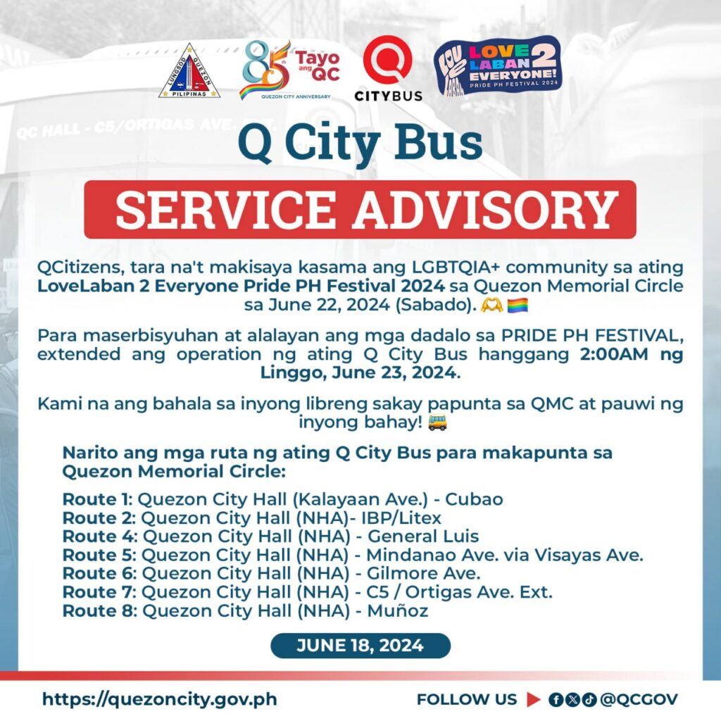Para maserbisyuhan at alalayan ang mga dadalo sa PRIDE PH FESTIVAL, extended ang operation ng ating Q City Bus hanggang 2:00AM ng Linggo, June 23, 2024: