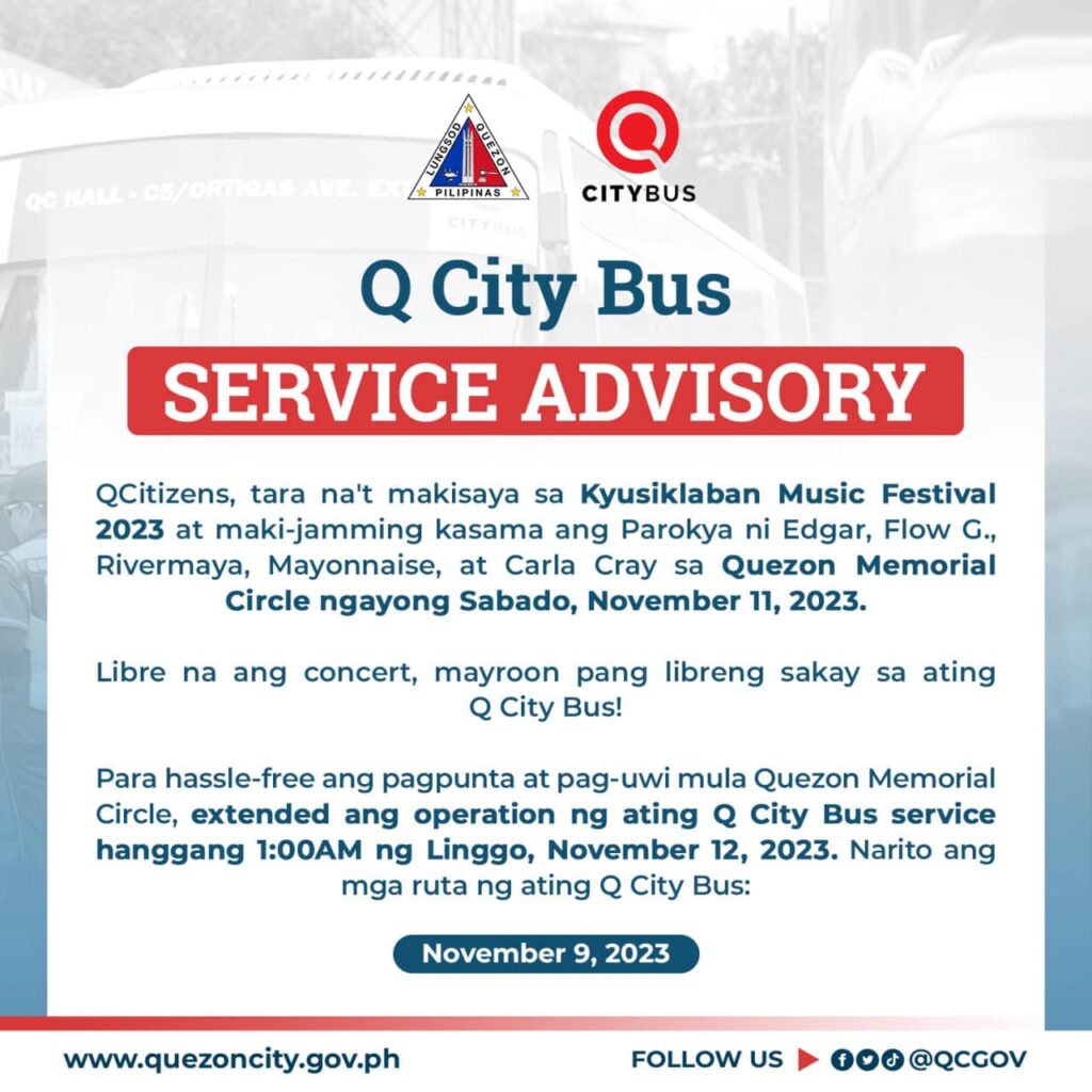 Para hassle-free ang pagpunta at pag-uwi mula Quezon Memorial Circle, extended ang operation ng ating Q City Bus service hanggang 1:00AM ng Linggo, November 12, 2023. Narito ang mga ruta ng ating Q City Bus: