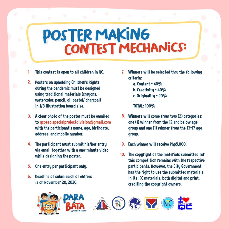 Lahat ng #BatangQC ay maaring sumali at magpadala ng kanilang poster tungkol sa karapatan ng mga bata ngayong pandemya. (Children’s rights during the pandemic)