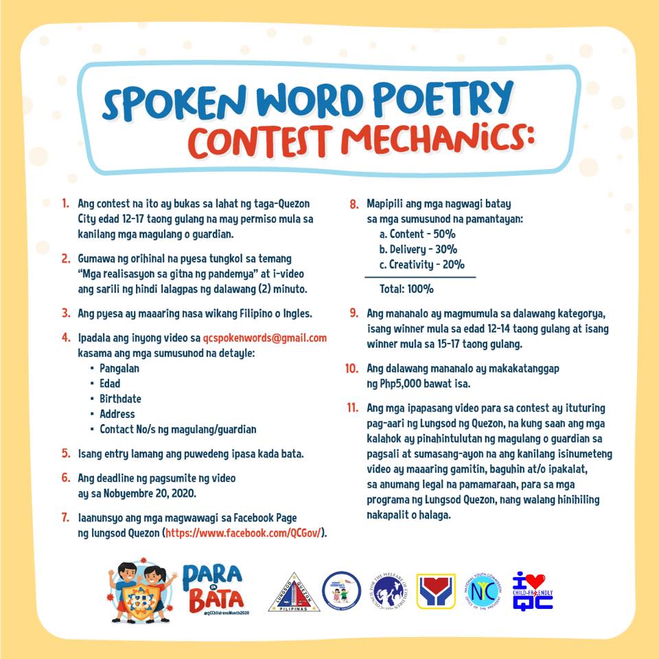 Ipadala sa qcspokenwords@gmail.com hanggang November 20, 2020.Tingnan ang iba pang contest mechanics: