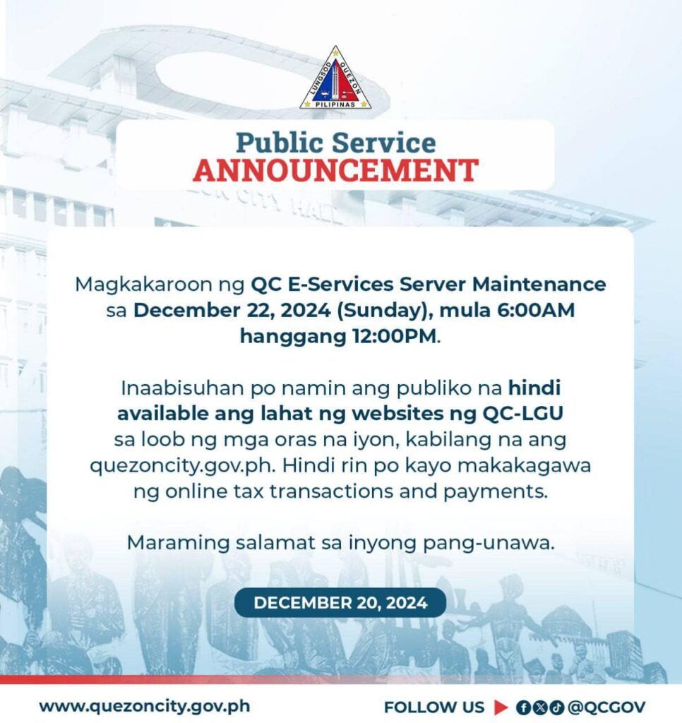Magkakaroon ng QC E-Services Server Maintenance sa December 22, 2024 (Sunday), mula 6:00AM hanggang 12:00PM.