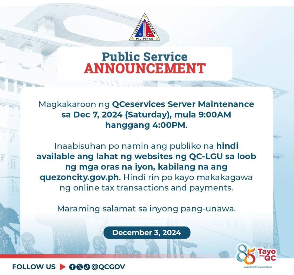 Inaabisuhan po namin ang publiko na hindi available ang lahat ng websites ng QC-LGU sa loob ng mga oras na iyon, kabilang na ang quezoncity.gov.ph. Hindi rin po kayo makakagawa ng online tax transactions and payments.