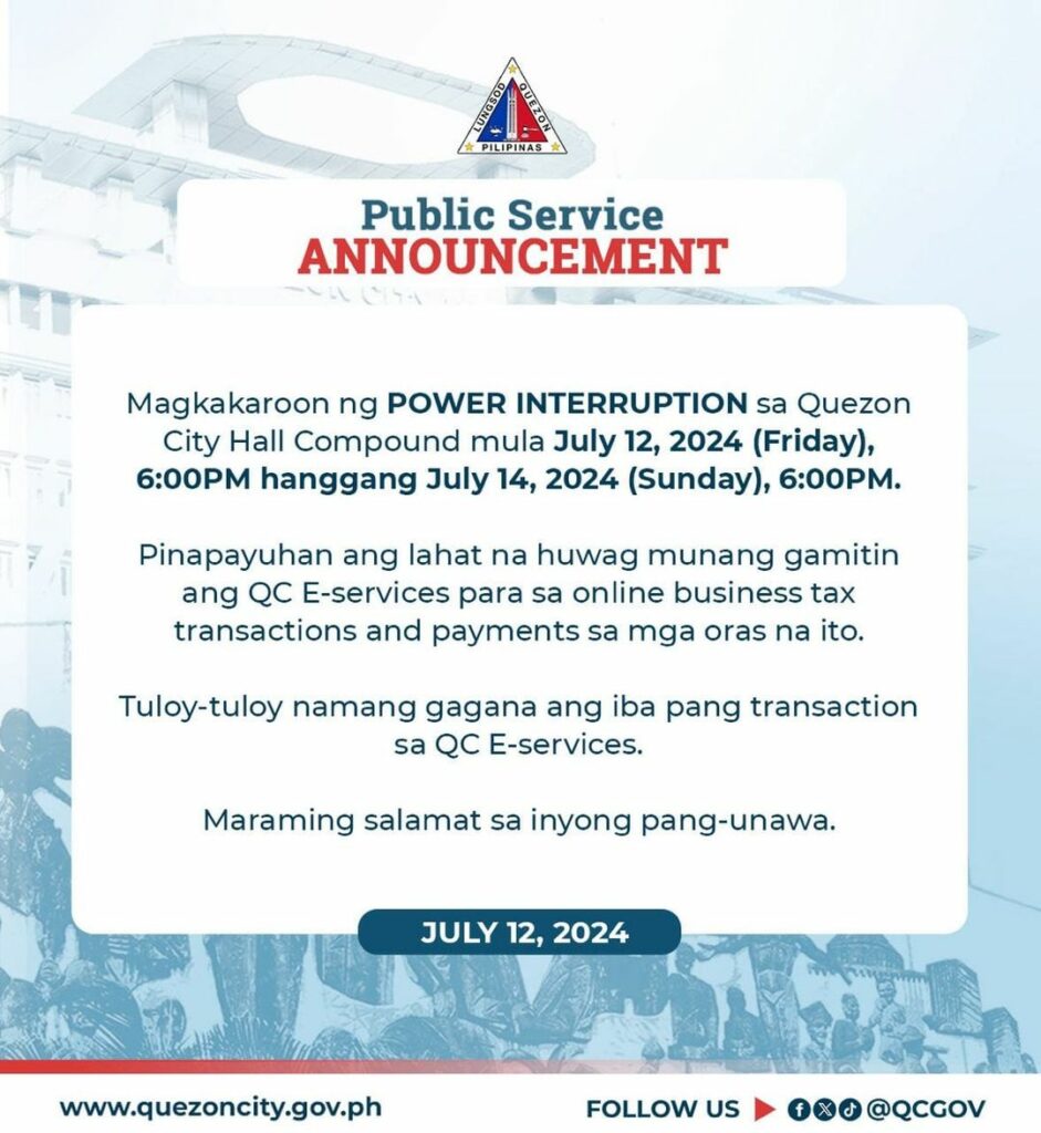 Magkakaroon ng POWER INTERRUPTION sa Quezon City Hall Compound mula July 12, 2024 (Friday), 6:00PM hanggang July 14, 2024 (Sunday), 6:00PM.