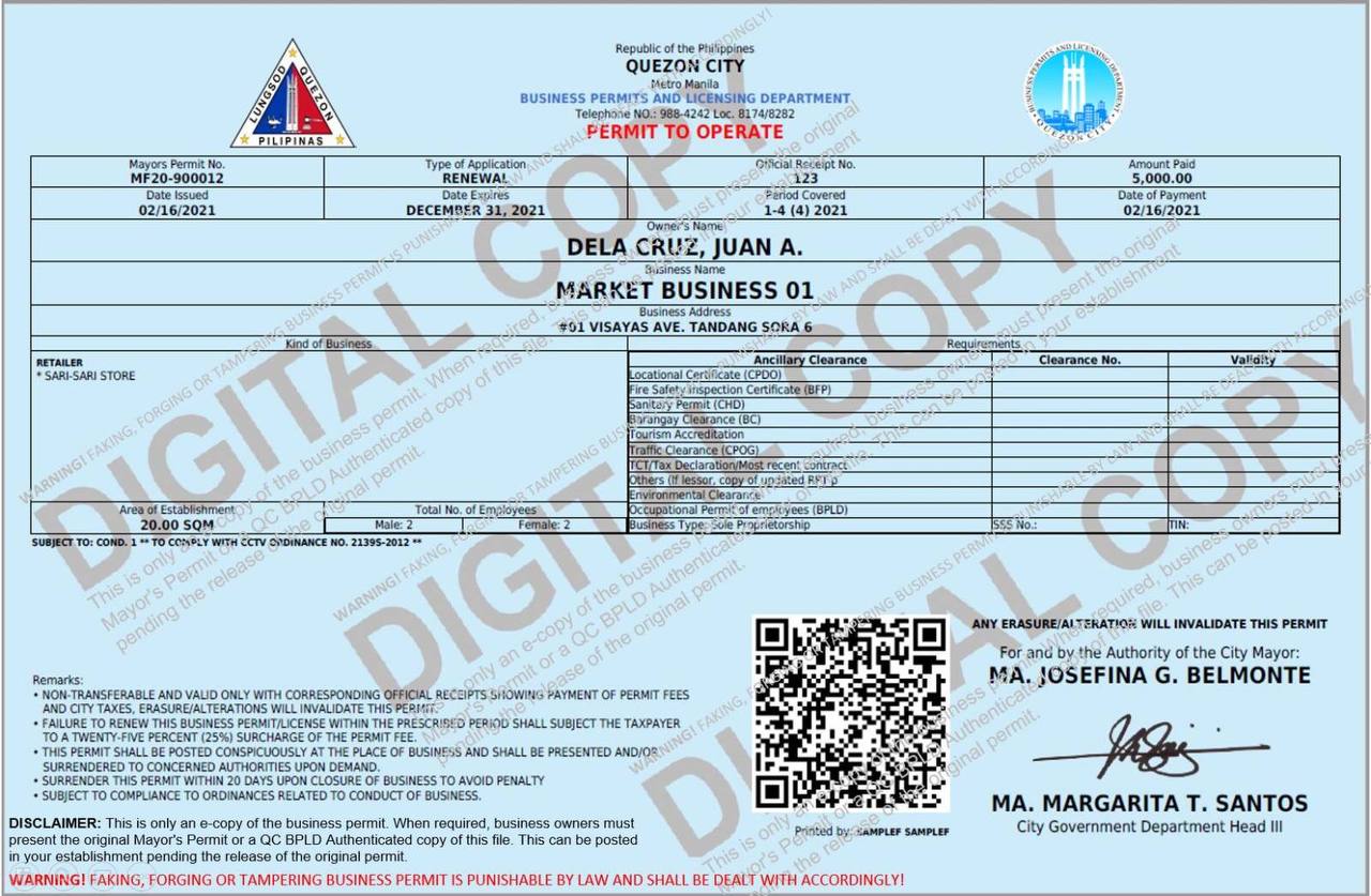Business owners in Quezon City will now be issued an electronic copy of their business permit once their application for renewal or new permit has been approved via the QC E-Services online portal.